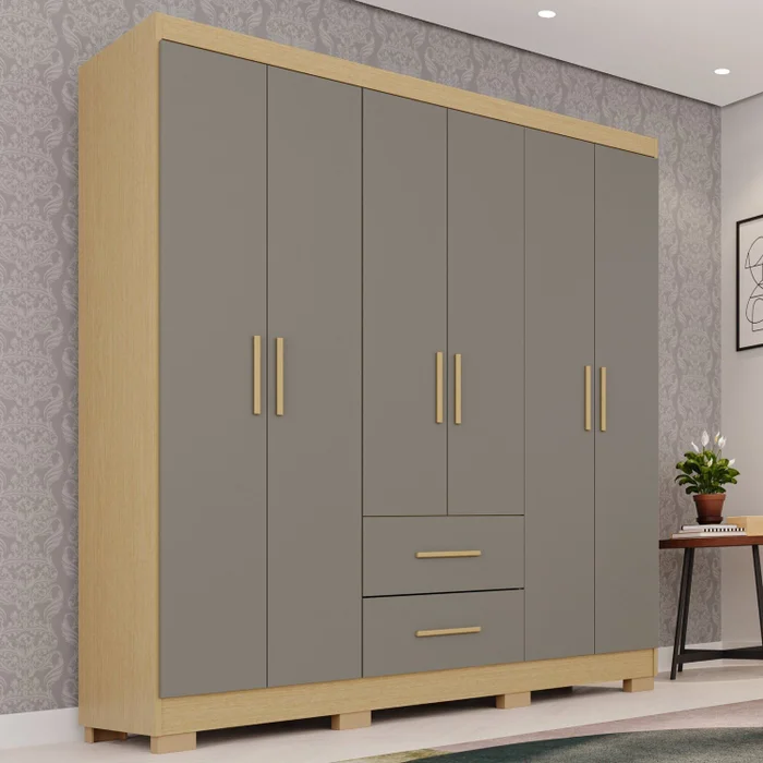 • Amplo Espaço Interno: Com 150 cm de largura e 180 cm de altura, o móvel oferece excelente capacidade de armazenamento. Suas 6 portas de bater dão acesso fácil a um interior que inclui cabideiros essenciais para manter vestidos, camisas e calças pendurados e livres de amassados.