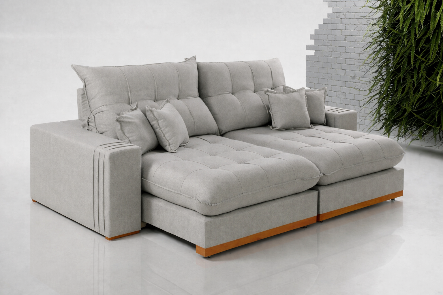 ASSENTO: Pillow 25 cm – EPS – Mola ensacada de 15 cm – Espuma D28 – Manta Siliconada – Detalhe em madeira de eucalipto tratado – Retrátil de metal;